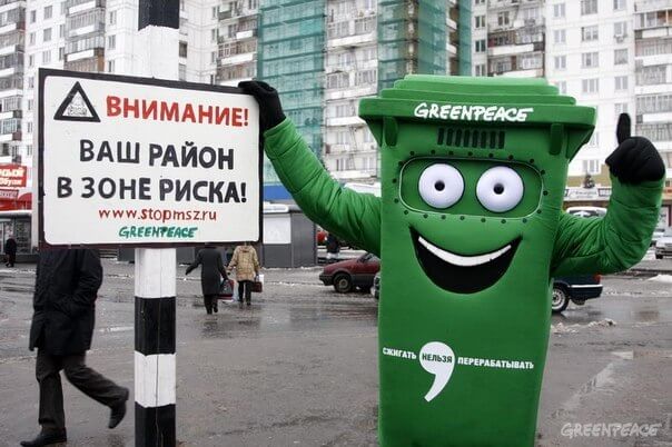 Для привлечения внимания в Гринпис Росии часто используют символ антимусоросжигательного движения, знакомьтесь – Мусор Ресурсович Вторичный. Это зеленый мусорный бачок, который стал всемирно известным героем: он участвовал в акциях, конференциях, давал интервью, гулял по улицам и фотографировался на фоне достопримечательностей. Его несколько раз арестовывали, в том числе когда он сдавал в Администрацию Президента подписи против строительства одного из мусоросжигательного завода.