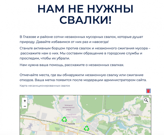 Вы житель Глазова? Юлия и ее коллеги из Экоклуба просят рассказать о незаконных свалках. Если вы обнаружите мусорную свалку или место сжигания отходов, отметьте их на карте. Так вы поможете избавить город от экологических проблем.
