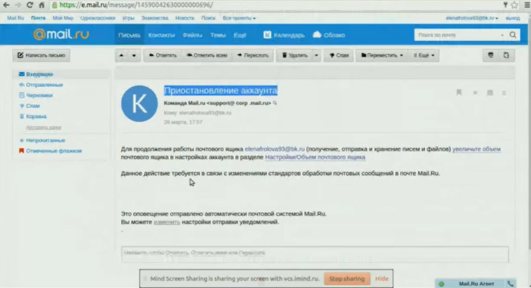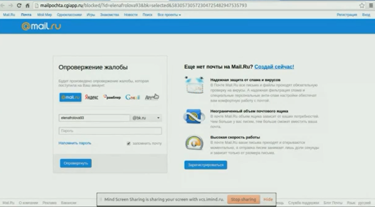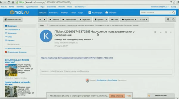 С целью ввести пользователя в заблуждение ему сообщают, что его почтовый ящик будет заблокирован в связи с поступившей на него жалобой. Подпись — «Администрация mail.ru», в конце подписи — логотип, сообщение отмечено как важное. В теле письма — кликабельная ссылка «опровергнуть жалобу». Если нажать на нее, открывается страница, где уже введена почта и надо только ввести пароль. Таким образом злоумышленники и захватят эти данные.