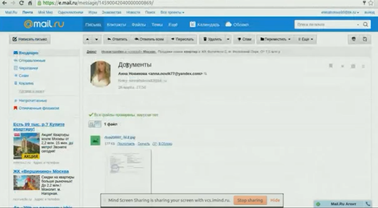Открываем вложение, и нас будто выкидывает из почты: «Соединение было прервано. Введите логин и пароль». По инерции многие в этом случае вводят эти данные, и таким образом злоумышленники перехватывают их. Здесь опять подозрительный домен — e.mail.ru-cgi.be.