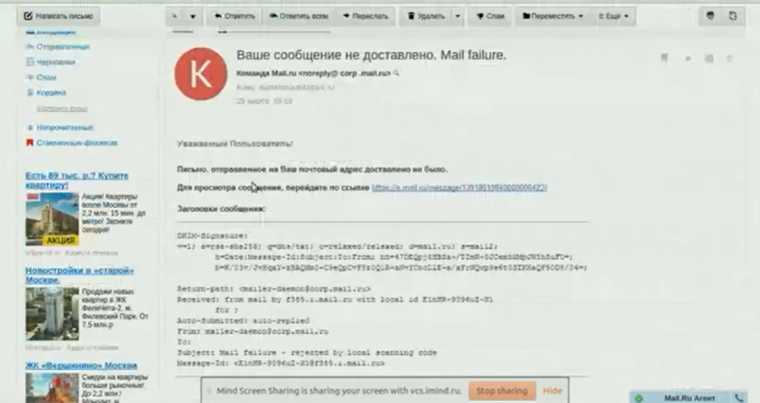 В этом случае стоит обратить внимание на детали. Компания Mail.ru на тот момент переехала, а в подписи указан старый адрес. Там же нет логотипа компании. А сам почтовый адрес выглядит странно — внтури него есть пробелы.