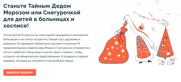 Оксана рассказала, что вместо отдельного лендинга они сделали внутреннюю страницу на основном сайте. Там разместили краткое описание новогодней акции «Праздник со смыслом», призыв к участию, две кампании по сбору средств и благодарность донорам.