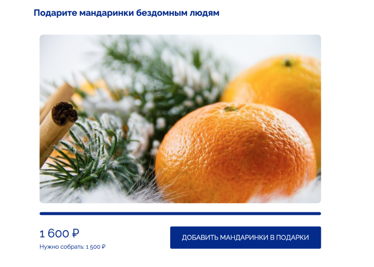 В канун Нового года волонтеры этой организации собирают для бездомных новогодние подарки со сладостями, полезными вещами и мандаринами, чтобы показать им, что они не одиноки. В этот раз для сбора денег на подарки Екатерина создала сайт организации с отдельной новогодней страничкой. На ней сторонники могли сделать денежное пожертвование на мандарины или узнать, как передать вещи.