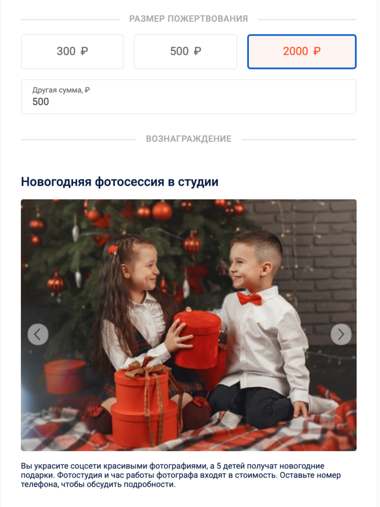 — сценарий «Чарити бокс» — для лендингов, на которых представлена сувенирная продукция (мерч) фонда, и пользователям предлагается приобрести ее за пожертвования. Например, несколько вариантов готовых наборов подарков. В этом сценарии используется обновленный функционал «Лейки»;