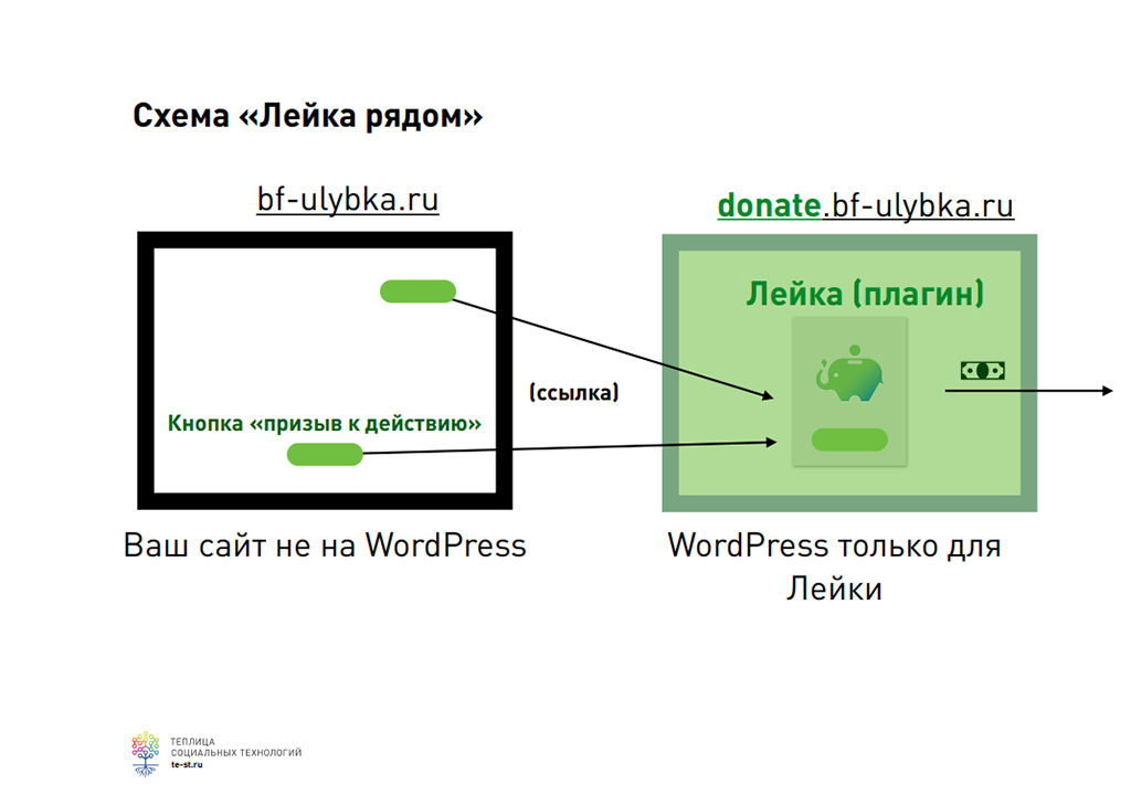 Плагин – это расширение для сайта, предназначенное для добавления новых функций. «Лейка» играет роль промежуточного звена между жертвователем и платежной системой. Плагин не собирает комиссию и записывает только те данные, которые необходимы для коммуникации. Деньги проходят через платежную систему и отправляются на расчетный счет организации.