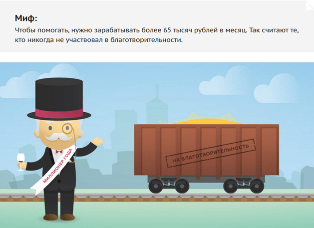 Обратите внимание на выбор между помощью деньгами и делом. Интернет-пользователи иногда могут не догадываться, что организации можно помочь делом, и со временем он начинает верить, что благотворительность начинается только с денег. Проект «Добро Mail.ru» проводит важную информационную работу как раз по борьбе с такими мифами и стереотипами.
