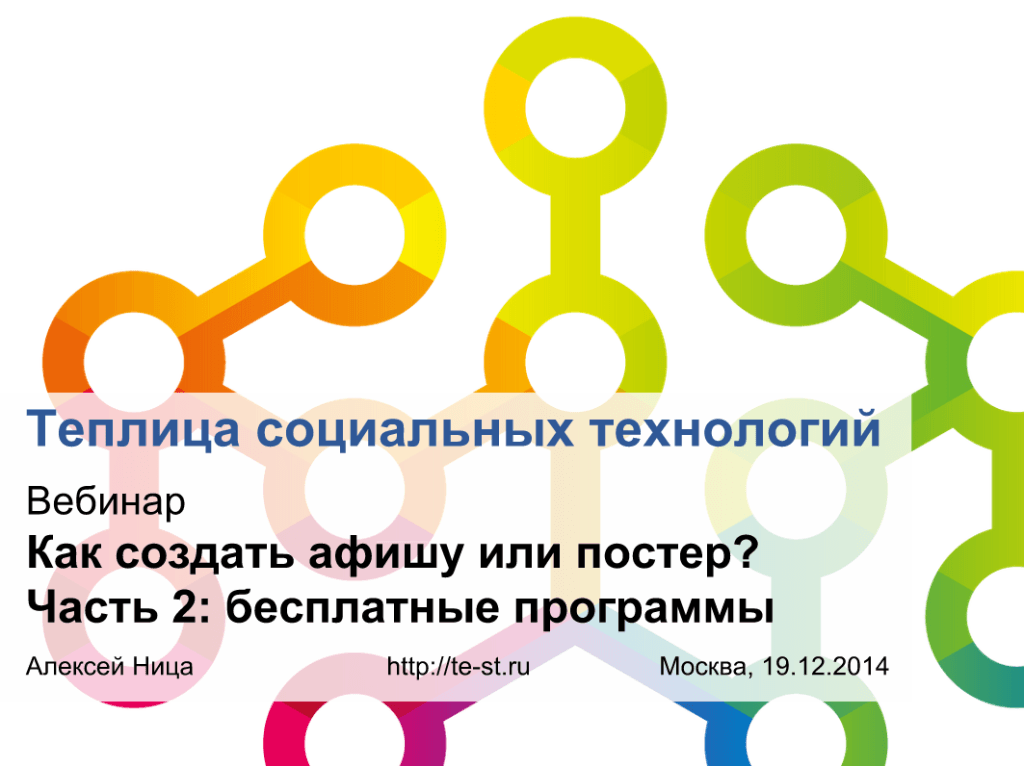 19 декабря прошел вебинар «Как создать афишу или постер? Часть 2: бесплатные программы», цель которого – рассказать о бесплатных программах и о том, как самостоятельно сделать эффективную афишу, которая привлечет людей к вашему мероприятию или кампании как в социальных сетях, так и в распечатанном виде.