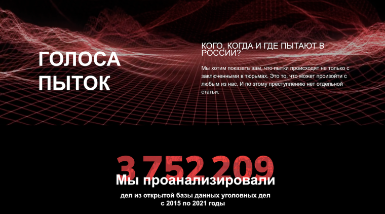 Команда второго проекта-победителя «Голоса пыток» анализировала дела с целью обратить внимание людей на правосудие в России. Выяснилось, что слово «пытки» встречается более 3 тысяч раз более чем в 3 млн уголовных дел. А слово «изнасилование» — 1300.