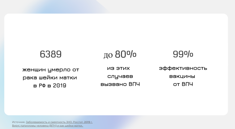 Команда работала над исследованием с помощью анализа и визуализации данных, чтобы обосновать необходимость включения в федеральный ОМС прививки от вируса папилломы человека (ВПЧ). Аргументация подкреплена, в том числе, данными ВОЗ, клинических исследований, тендеров на закупки вакцины в тех регионах, где она уже доступна по территориальной программе, а также стоимостью самостоятельной вакцинации.