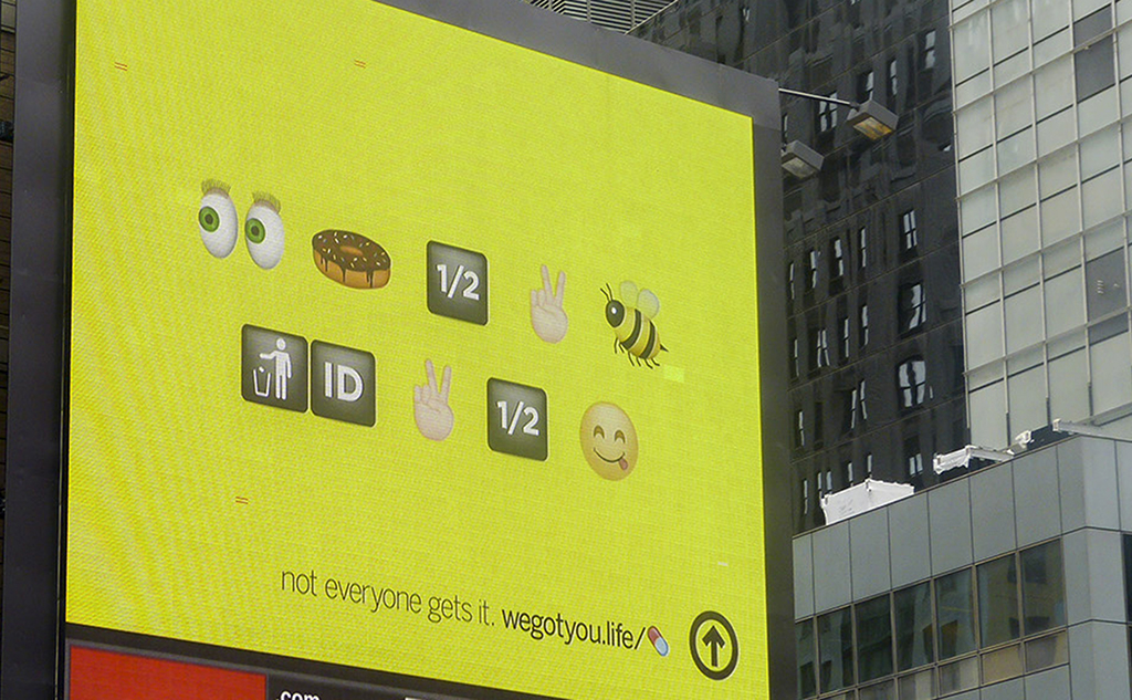 Эмодзи — язык идеограмм и смайликов, используемый в электронных сообщениях и веб-страницах. Этот графический язык, где вместо слов используются сочетания картинок, появился в Японии и распространился по всему миру. Так, например, американская общественная организация «Partnership for Drug-Free kids» запустила кампанию с плакатами для наружной рекламы, на которых зашифровано послание для детей об опасности употребления наркотиков на языке эмодзи.