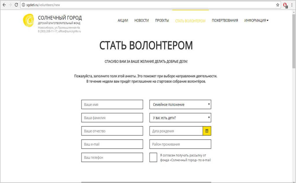 Проект «Лига волонтеров» объединяет усилия волонтеров для помощи детям, оставшимся без попечения родителей или оказавшимся в тяжелой жизненной ситуации. На данный момент активных волонтеров около 200 человек. Человек, желающий присоединиться к Лиге волонтеров, оставляет заявку на сайте фонда. Все заявки отображаются на сервере сайта, где сотрудники фонда могут видеть их, редактировать или удалять.